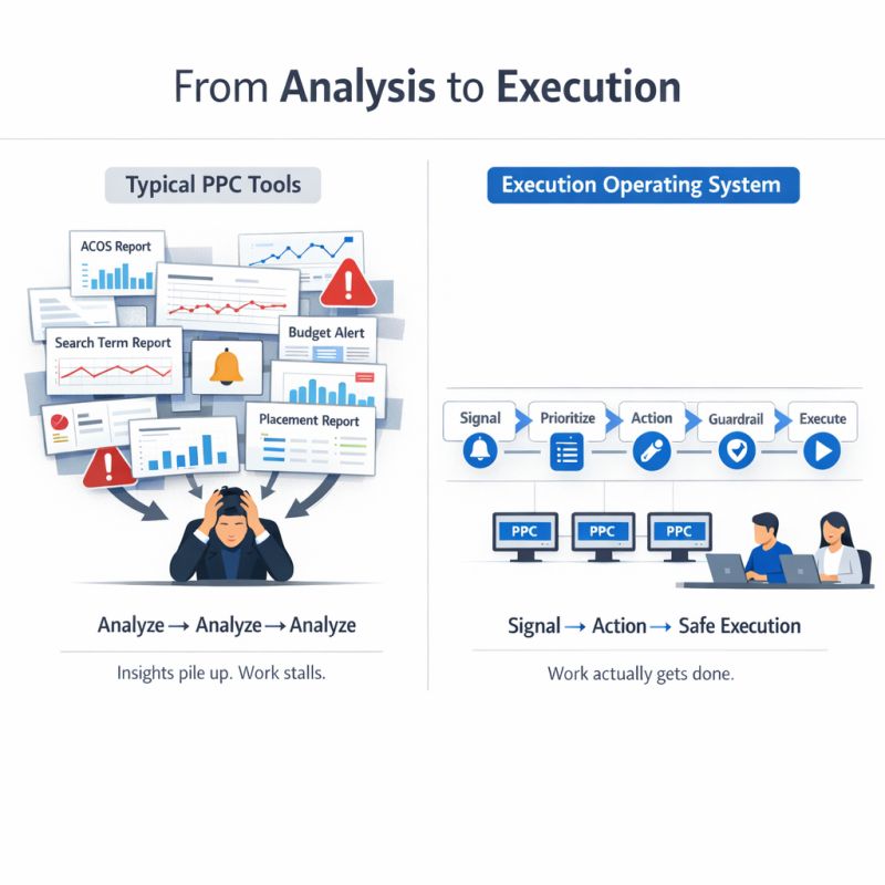 The goal is to help Amazon PPC teams see what matters first, move approved work through execution faster, and keep enough guardrails, visibility, and reversibility in place to trust the workflow under real account conditions.